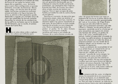 Existe un elemento de incomodidad al ver a un artista hacer un rompimiento con su estilo anterior. “¿Qué está haciendo Sobrino? ¿Pa’ dónde va? “Yo no lo entiendo”, escuché de varios amigos. La presencia de lo nuevo resulto siempre alarmante, aún para tos más adictos al vértigo del cambio. No soy una excepción confieso que este nuevo brinco de Sobrino también me estuvo chocante. Con todo lo mucho que alabamos el desarrollo o la progresión en el arte, cada nuevo rumbo en la obra de los artistas nos desconcierta.