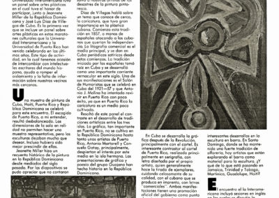 Díaz de Villegas habló sobre un tema que conoce de cerca, la caricatura, que tuvo gran importancia en la plástica cubana. Comienza esta tradición en 1857, a manos de españoles atacando a los cubanos que querían la independencia. La litografía comercial es el medio principal, y se dan en Cuba periódicos satíricos desde estos comienzos. La tradición, iniciada por los españoles tomá raíz en Cuba y se desarrolló como una importante corriente vernacular en este siglo. Una de sus manifestaciones es el Salón de Humoristas que se celebró en Cuba del 1921-57 y que Antonio J. Molino ha intentado revivir en Puerto Rico con poco éxito, ya que en Puerto Rico la caricatura es un medio poco cultivado. Resaltó de este panel el contraste en el desarrollo de tradiciones artísticas entre las tres islas: La gráfica, tan importante en Puerto Rico, no se cultiva en la República Dominicana hasta tanto unos artistas de Puerto Rico, Antonio Martorell y Consuelo Gotay, principalmente, despiertan el interés por este medio en la isla hermana. Las presentaciones de gráfica y poesía del grupo Guajana han hecho historia en la República Dominicana.
