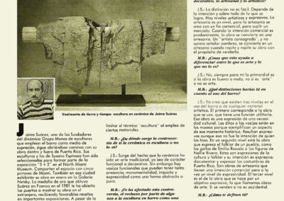 J.S._Yo creo que existen tres niveles en el uso del barro o de cuarquiere material artístico. El primero corresponde a la obra que se usa, que tiene una función utilitario. Esa obra es una expresión de una necesidad cultural. las ditas o las vasijas están en los museos porque ejemplifican un aspecto de ese momento histórico. Resultan expresivas aunque esa no fue la intención de quien las hizo. En un segundo nivel está la obra que expresa el folklor de un pueblo, como los gallos de Emilio Rosado o las figuras de Nellie Rivera. Estas Son expresiones de la cultura y folklor y su intención es expresivo. documentar y expresar las costumbres de Puerto Rico, Son obras de artesanía que, tienen una intención comercial pero a la vez un nivel de expresividad. El tercer nivel es el de la obra que se hace por un objetivo expresivo, lo que llamamos obras de arte. Si se venden o no es accidental.